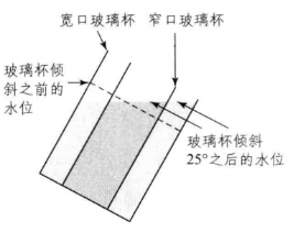 问题2是水溢出问题,图中这两个玻璃杯的高度是相同的,且被注入了相同水位高度的水。当它们发生倾斜,两个杯子中的水会在相同的倾斜角度开始溢出,还是会在不同的倾斜角度开始溢出?如果是不同的倾斜角度,那么是哪个杯子中的水先开始溢出?为了便于理解,将宽口玻璃杯套在了窄口玻璃杯的外面(如图6)。可以发现,当宽口玻璃中的水即将溢出时,窄口玻璃杯中的水距杯口边缘还有一段距离。因此,窄口玻璃杯需要倾斜更大的角度,杯中的水才能开始溢出。对于该问题,Schwatz和Black(1999)在实验中发现当要求被试回答水溢出问题,且不给他们对问题进行推理或使用心理表象的时间时,多数被试都会错误地认为两个玻璃杯的水会在相同的倾斜角度开始溢出。然而,当研究者告诉被试可以闭上眼睛并想象开始倾斜的玻璃杯,几乎所有被试都"看见"了窄口玻璃需要倾斜更大的角度,水才能开始溢出。