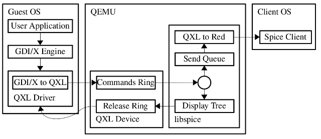 宿主应用层(Host Application):通常是QEMU,通过QXL虚拟显卡设备和其他虚拟设备(键盘、鼠标、音频)与SPICE服务器交互。QXL设备是一个专门为SPICE优化的图形设备,它通过共享内存环形缓冲区(Ring Buffer)与SPICE服务器高效通信。