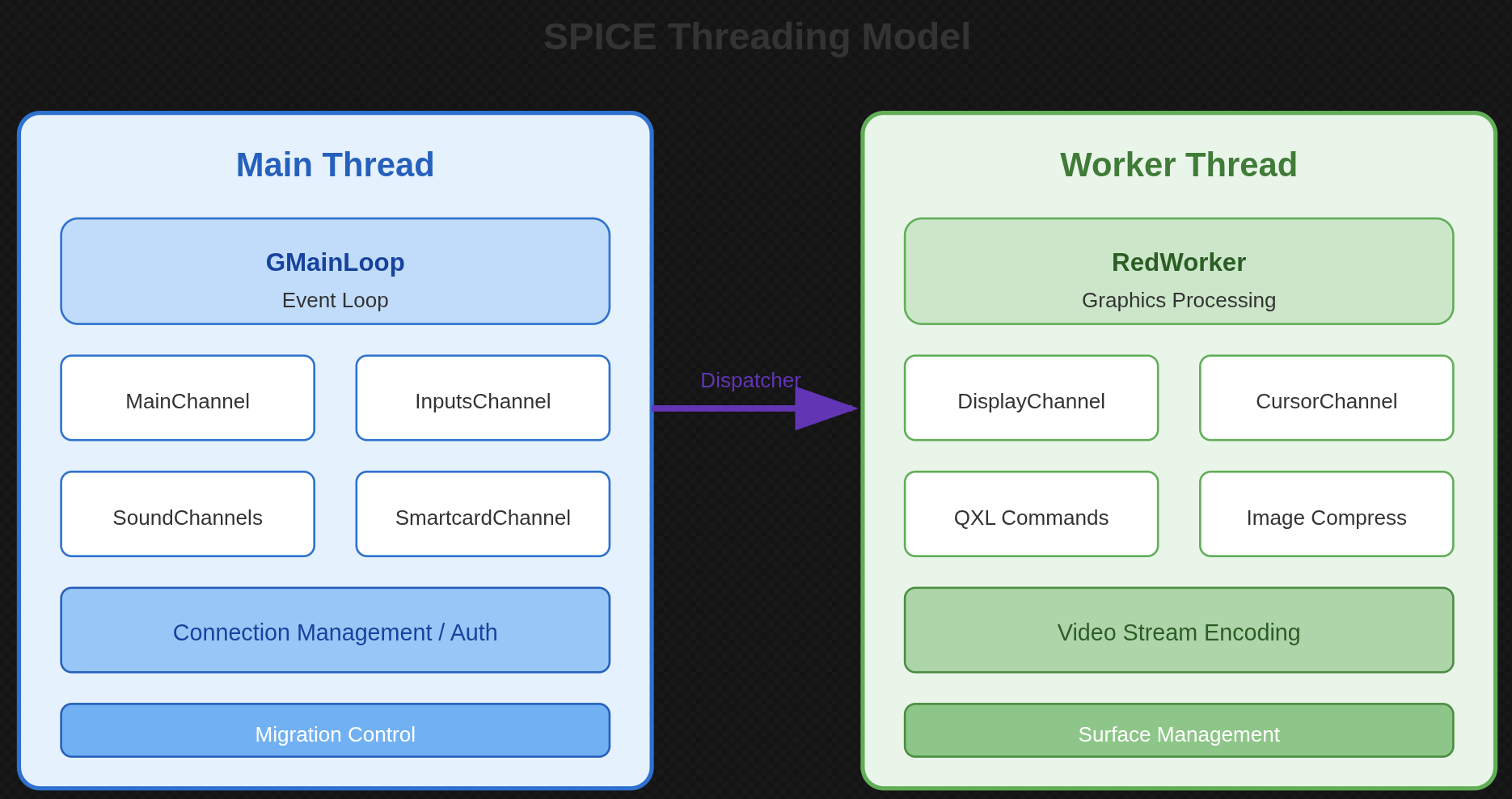 Worker线程职责:每个QXL虚拟显卡设备对应一个独立的Worker线程。这种设计将CPU密集型的图形处理操作从主线程中分离出来,避免阻塞其他通道的消息处理。Worker线程负责: