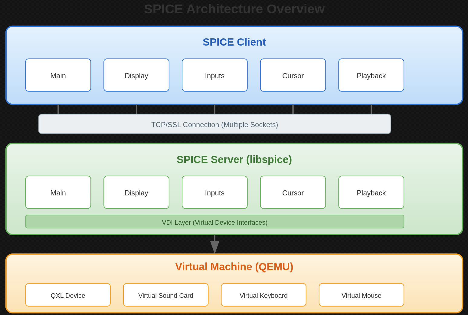 客户端层(SPICE Client):负责用户交互界面的呈现和输入事件的采集。客户端通过多个独立的通道与服务器通信,每个通道处理特定类型的数据流。这种设计允许不同类型的数据使用不同的QoS策略,例如显示数据可以容忍一定延迟但需要高带宽,而输入数据则需要低延迟但数据量很小。