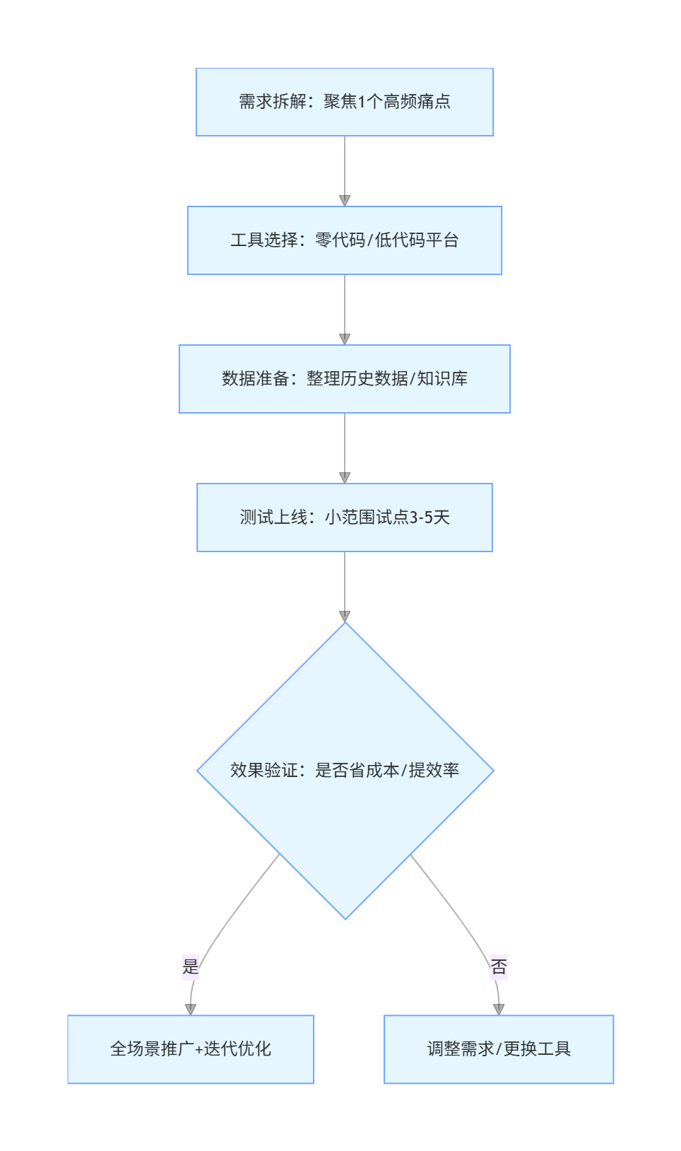 调研显示,中小企业落地智能体的核心诉求是 "低成本、快速回本",无需追求全功能。以下落地流程基于 20 + 中小企业案例提炼,零代码也能实现: