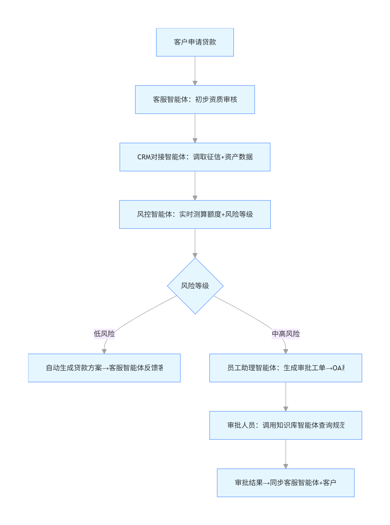 - 落地数据:贷款申请响应时间从 15 分钟缩至 2 分钟,人工审批效率提升 45%,坏账率下降 0.8%,已覆盖该行 60% 的个人信贷业务。