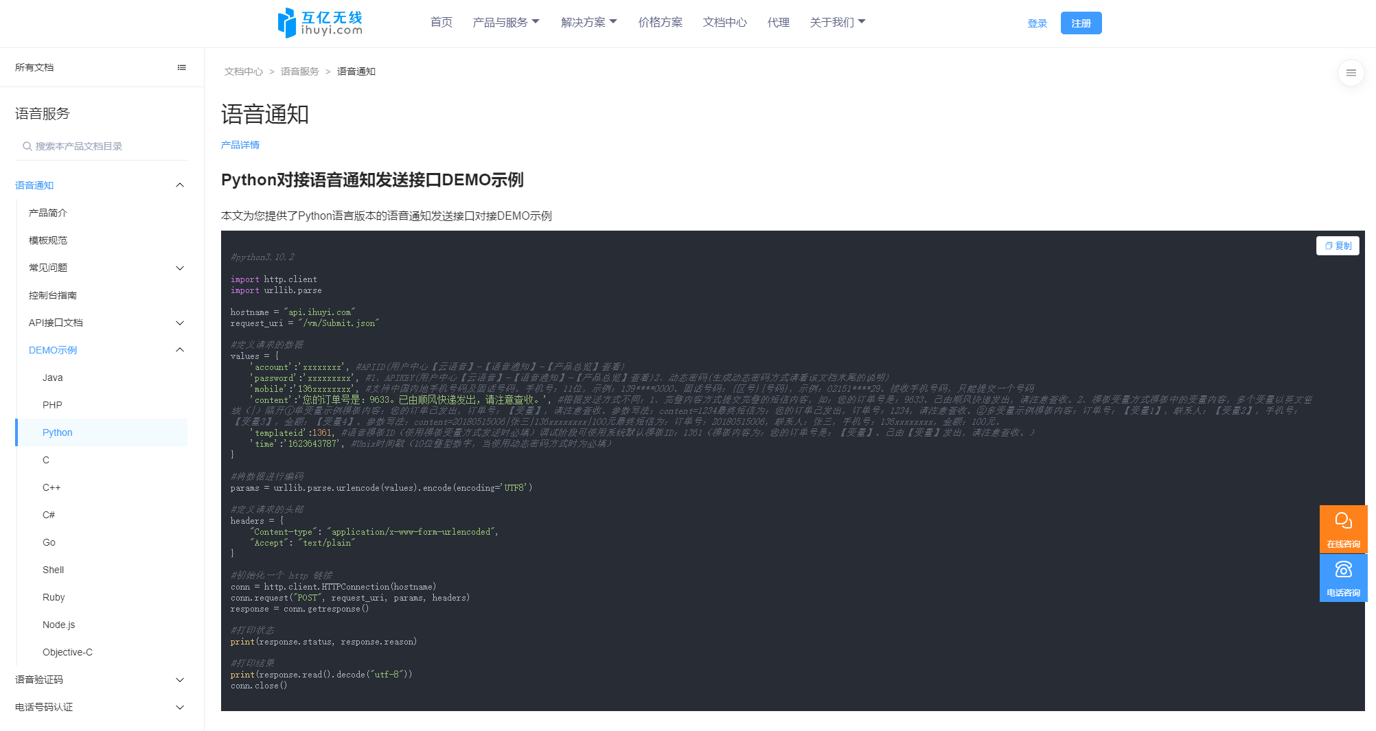 pip install requests; - 获取account和password:需在服务商平台注册开通语音通知服务(注册地址:http://user.ihuyi.com/?F556Wy);