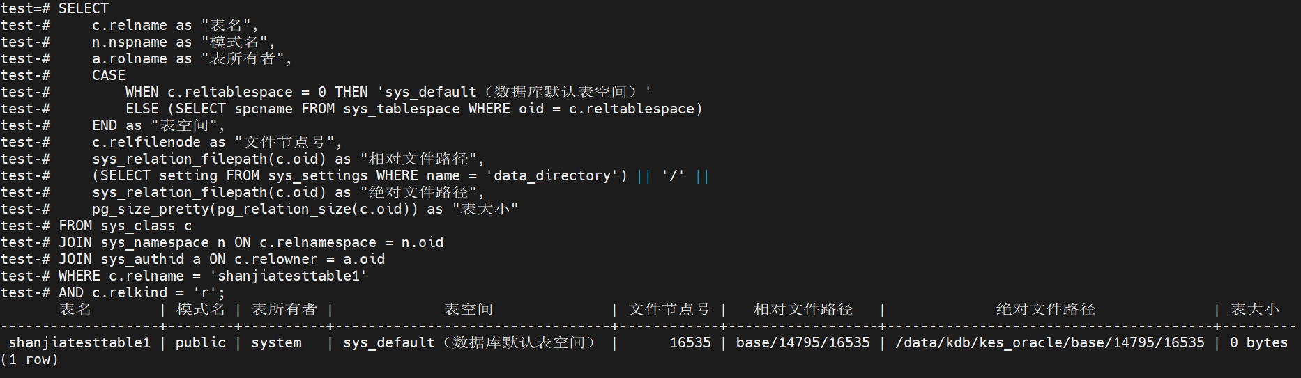 验证:通过查询系统目录,可以确认表的存储逻辑、物理位置和大小,输出示例: