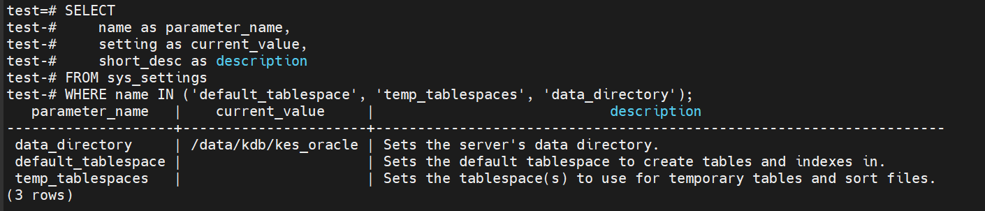 WHERE name IN ('default_tablespace', 'temp_tablespaces', 'data_directory');