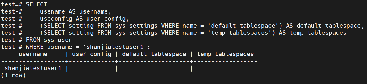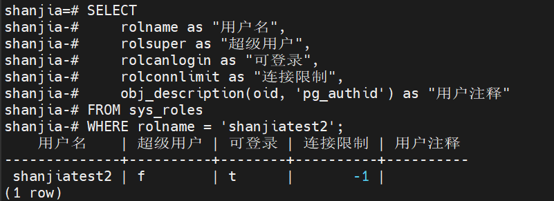 SELECT EXISTS(SELECT 1 FROM sys_roles WHERE rolname = 'shanjiatest2') INTO user_exists;