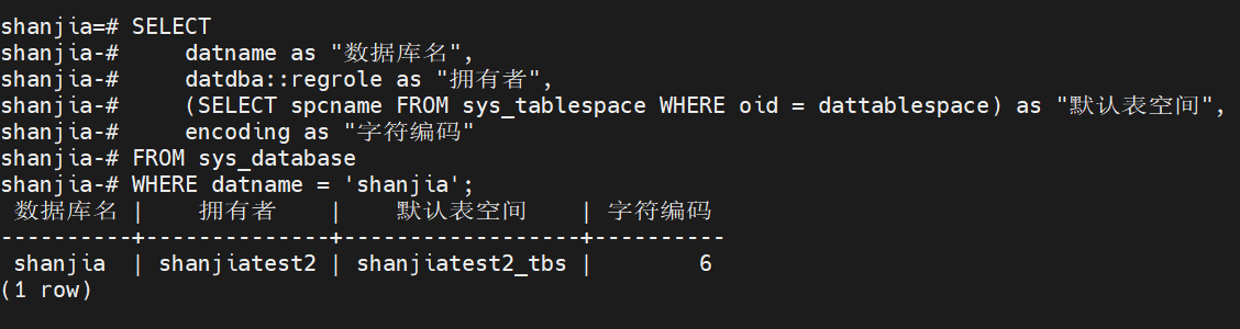 SELECT EXISTS(SELECT 1 FROM sys_database WHERE datname = 'shanjia') INTO database_exists;