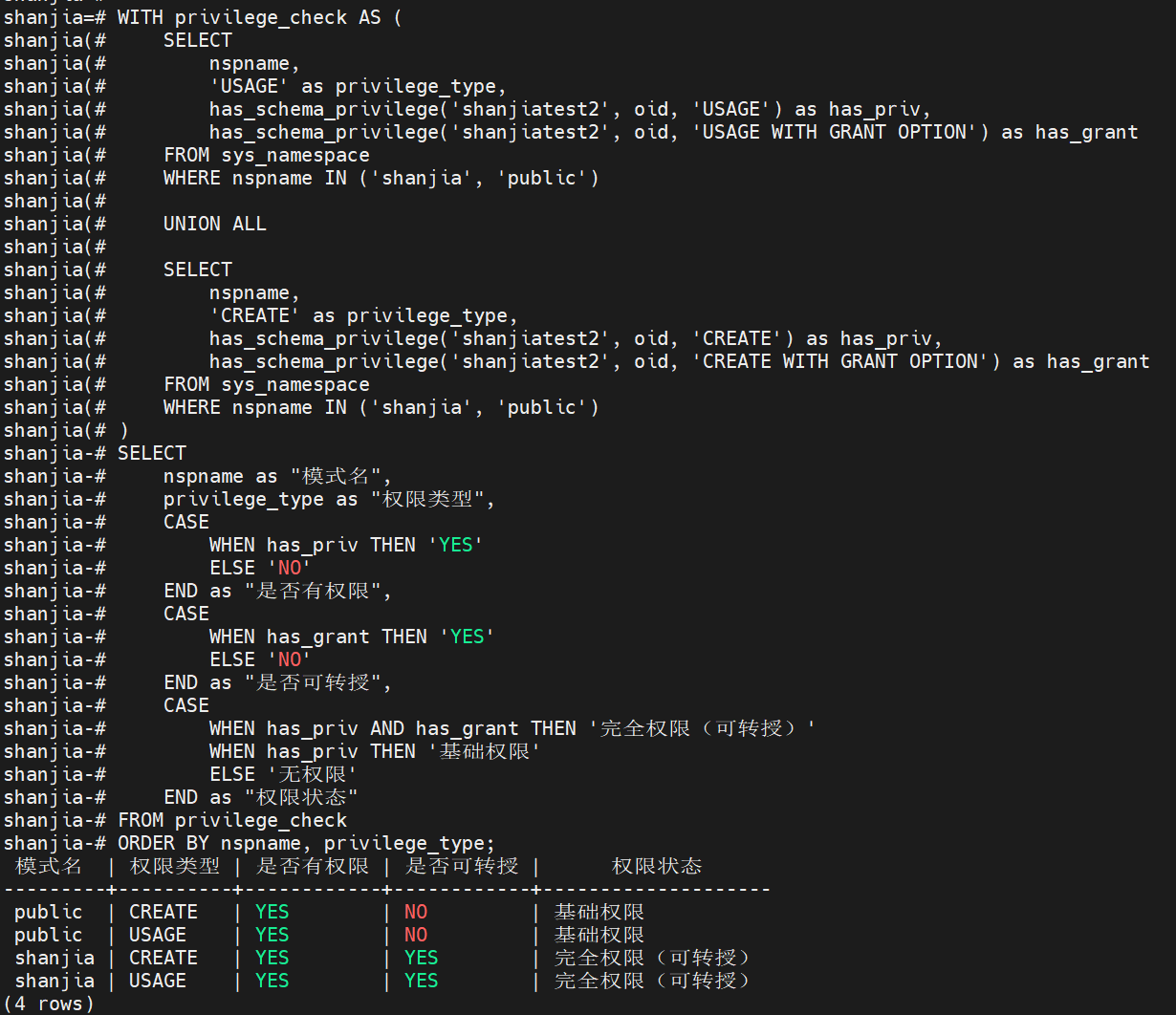 RAISE NOTICE 'Schema使用权限: %', CASE WHEN user_has_schema_usage THEN '✓ 有权限' ELSE '✗ 无权限' END;