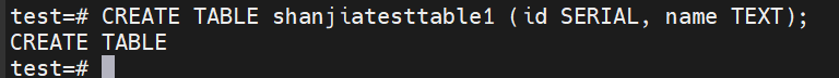 CREATE TABLE shanjiatesttable1 (id SERIAL, name TEXT);
