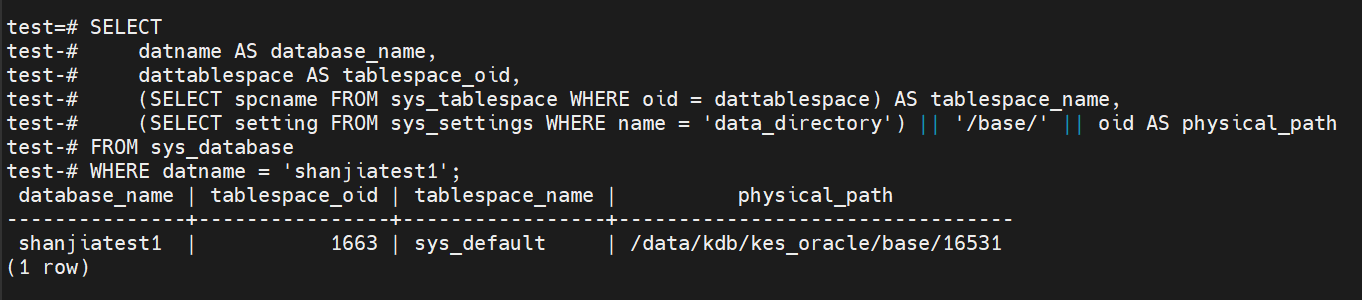 (SELECT setting FROM sys_settings WHERE name = 'data_directory') || '/base/' || oid AS physical_path