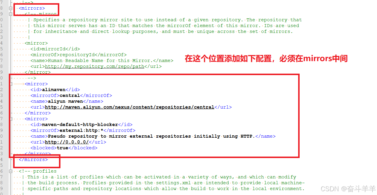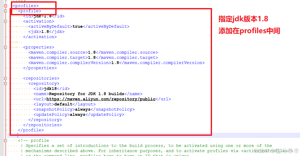 配置JDK,在settings.xml 文件中找到 profiles 节点: