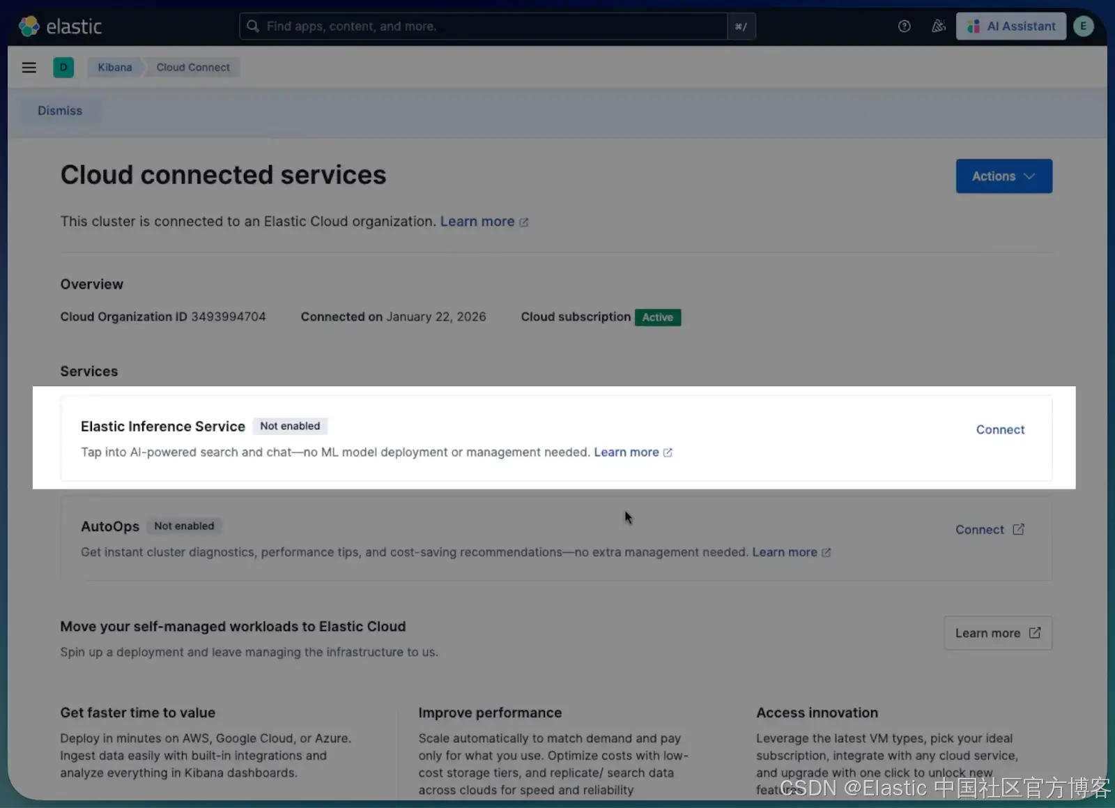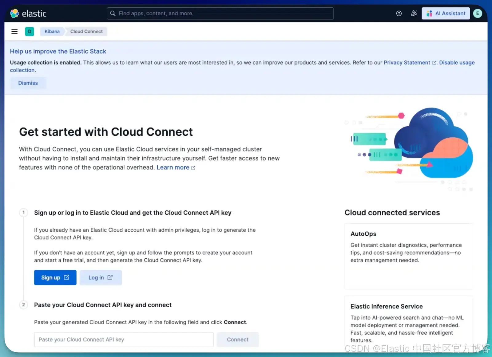 在 Cloud Connect 部分,点击 Connect to Elastic Cloud。