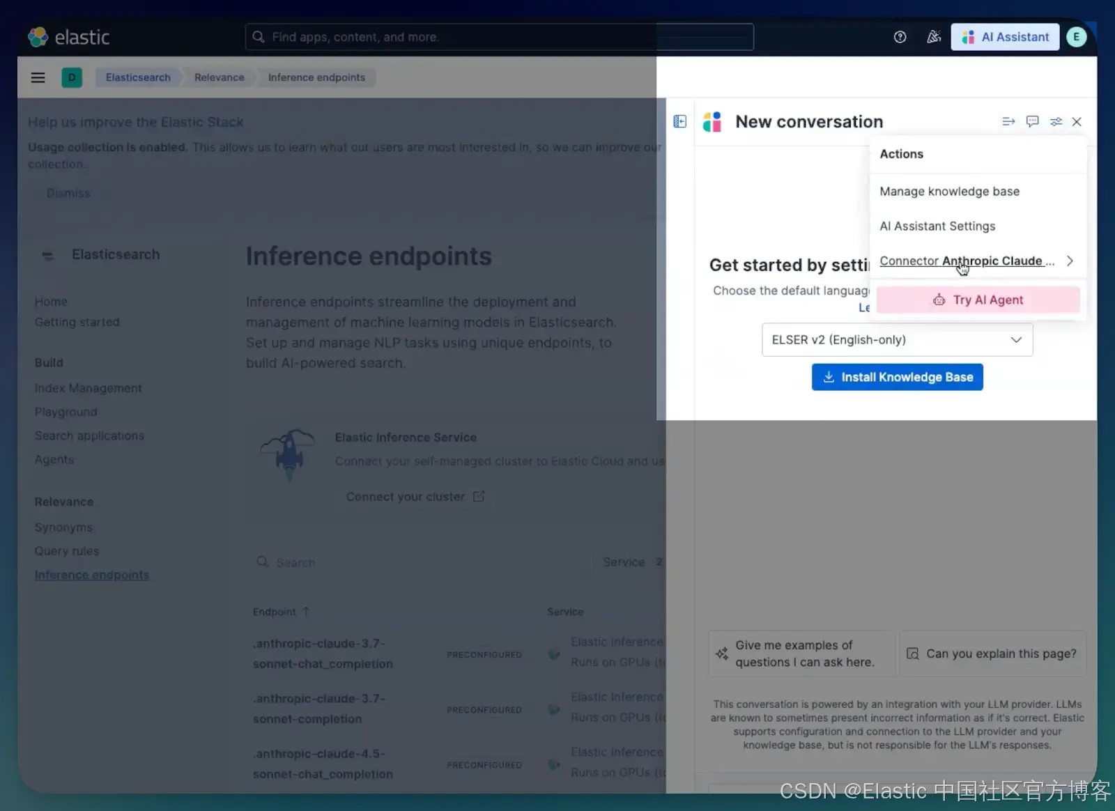 - 集成 workflows:这也为我们的内部 AI 工具提供动力。你的团队可以立即开始使用 Elastic AI Assistant 获取 observability insights,或使用 Attack Discovery 进行安全威胁分析,所有这些都由云托管的 LLMs 提供支持,并以你的本地数据为基础。