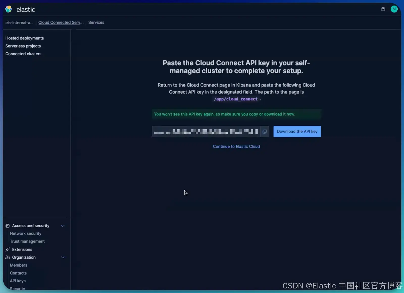 - 握手:你在 Elastic Cloud 生成 API key 并粘贴到自管理的 Kibana 实例中。这建立了一个安全、认证的桥梁。