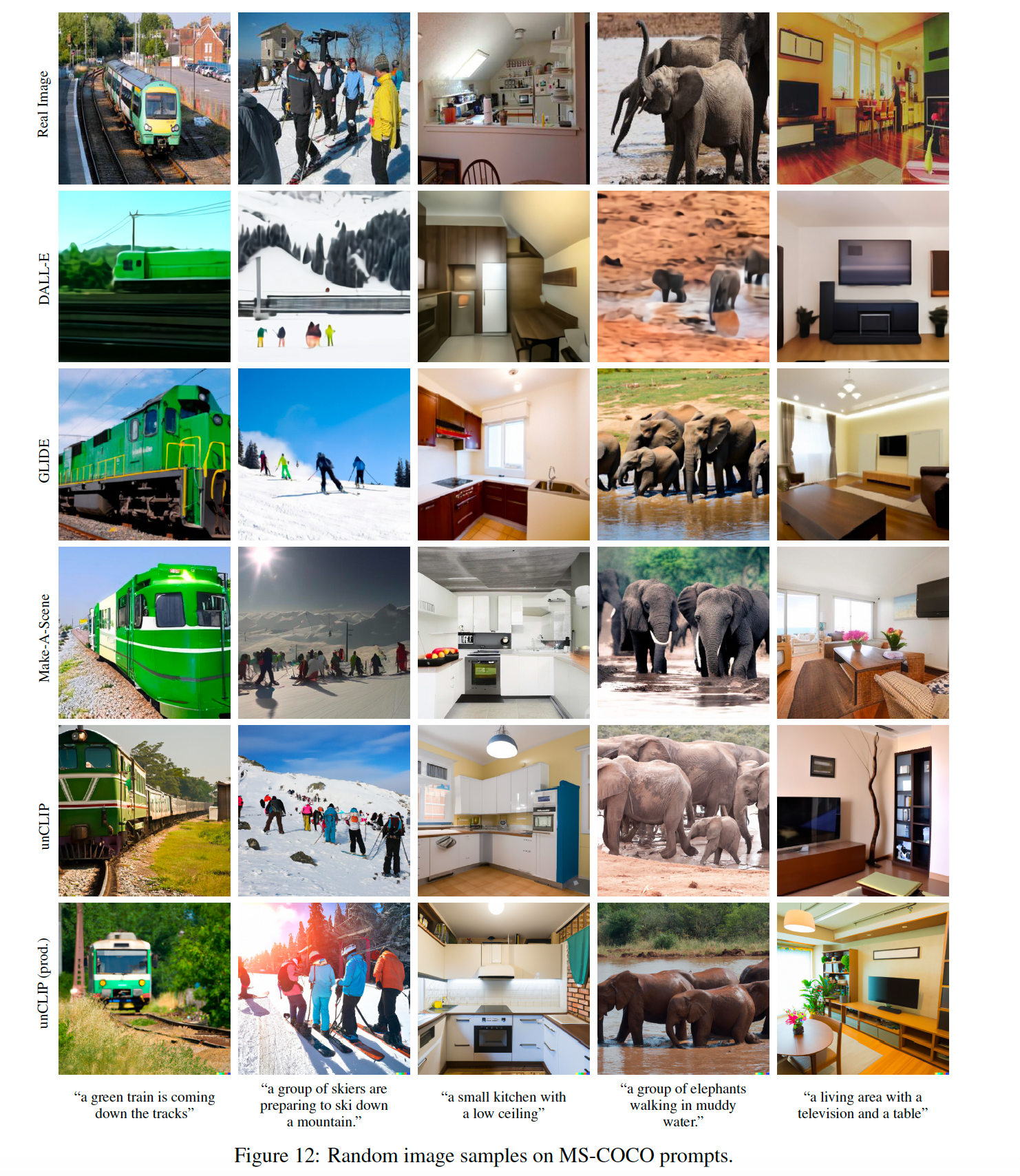 在文本条件图像生成文献中,在MS-COCO[28]验证集上评估FID已成为标准做法。我们在表2中展示了该基准测试的结果。与GLIDE和DALL-E一样,unCLIP没有直接在MS-COCO训练集上训练,但仍然可以零样本泛化到验证集。我们发现,与这些其他零样本模型相比,当使用扩散先验进行采样时,unCLIP实现了10.39的最新FID。在图12中,我们在几个来自MS-COCO的标题上,将unCLIP与各种最近的文本条件图像生成模型进行了视觉比较。我们发现,与其他方法一样,unCLIP生成了捕捉文本提示的现实场景。