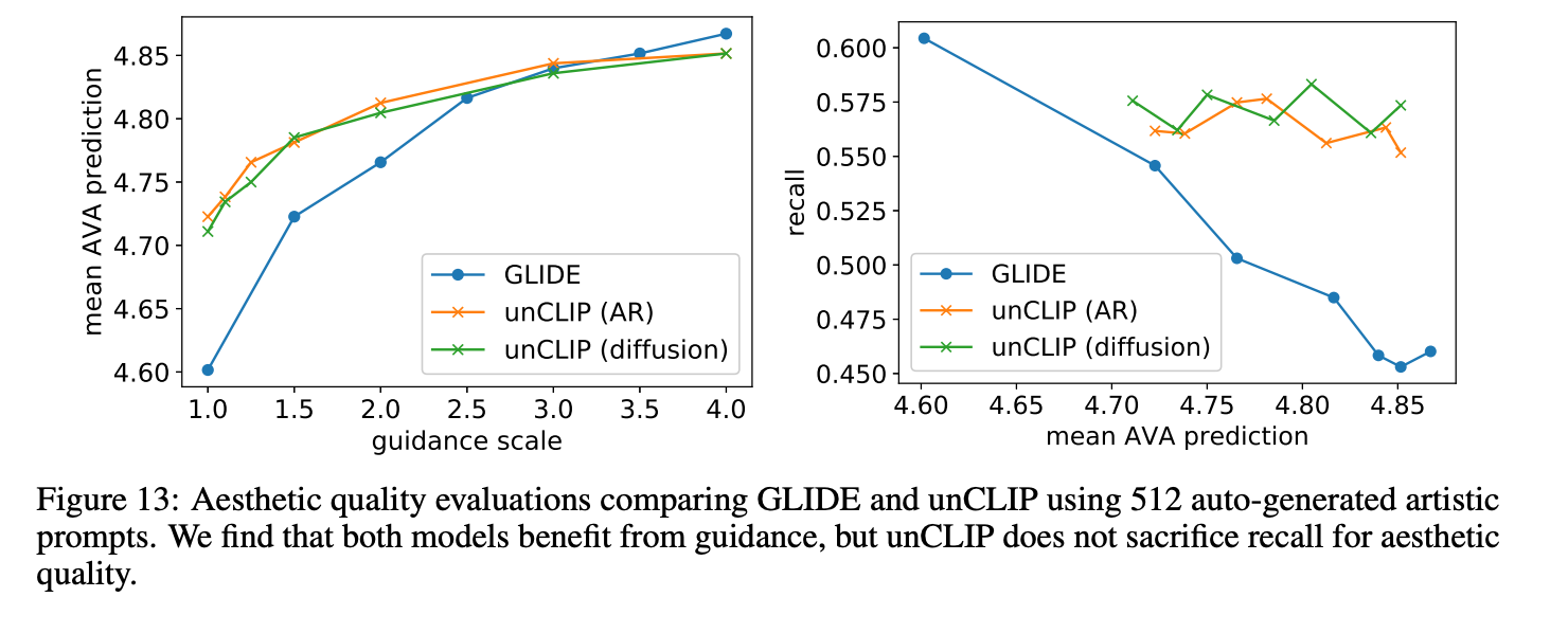 在图13中,我们展示了美学质量评估的结果。我们发现引导提高了GLIDE和unCLIP的美学质量。对于unCLIP,我们只引导解码器(我们发现引导先验会损害结果)。我们还绘制了美学质量与Recall5^55的关系图,因为引导通常会在保真度和多样性之间进行权衡。有趣的是,我们发现根据这个指标,引导unCLIP不会降低Recall,同时仍然提高了美学质量。