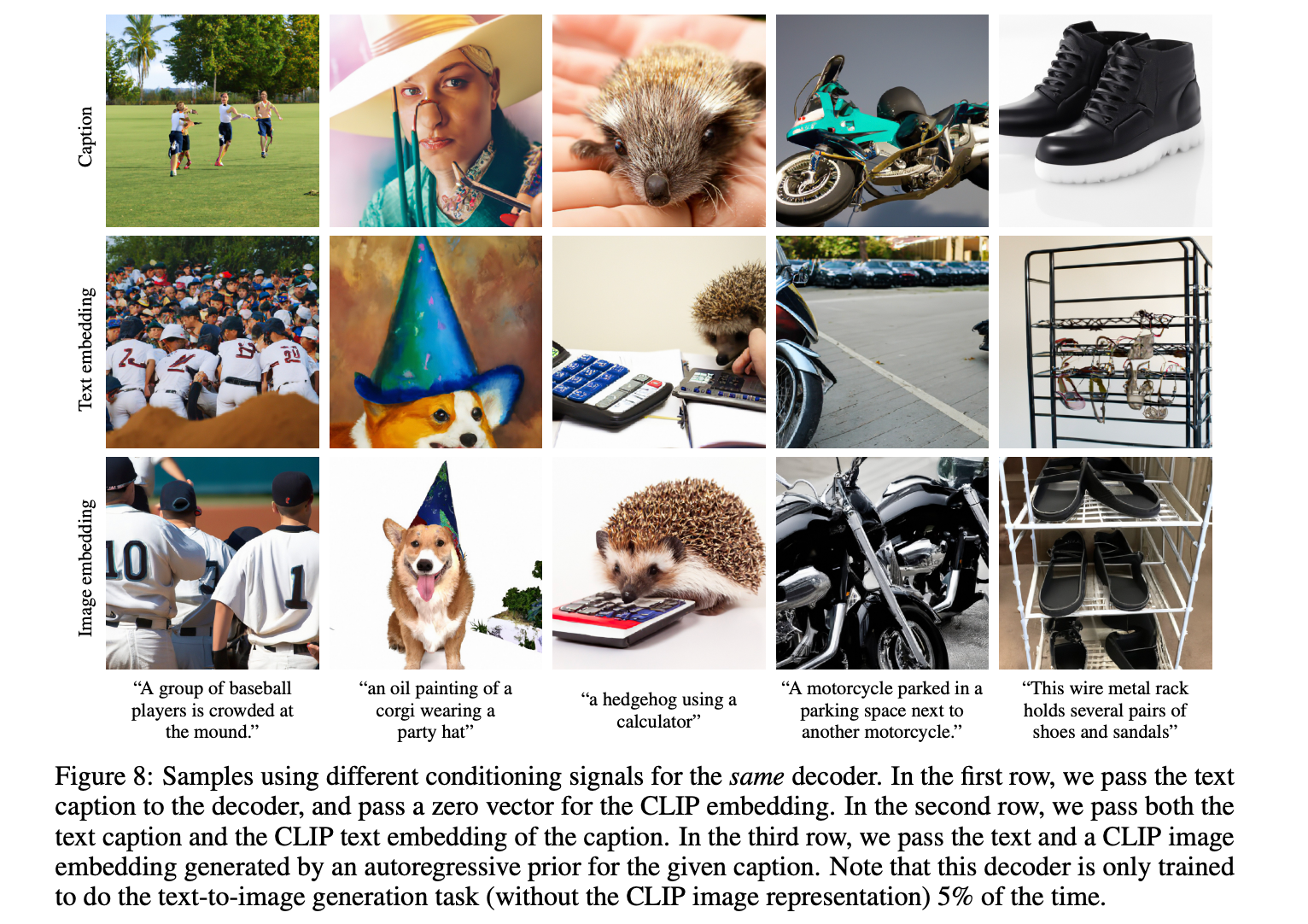 图8的前两行描述了以这两种方式获得的样本;第三行描述了使用先验获得的样本。仅以标题为条件的解码器显然最差,但以文本嵌入零样本为条件确实产生了合理的结果。基于这一观察,另一种方法是训练解码器以CLIP文本嵌入[9]为条件,而不是CLIP图像嵌入(尽管我们会失去第4节中提到的能力)。