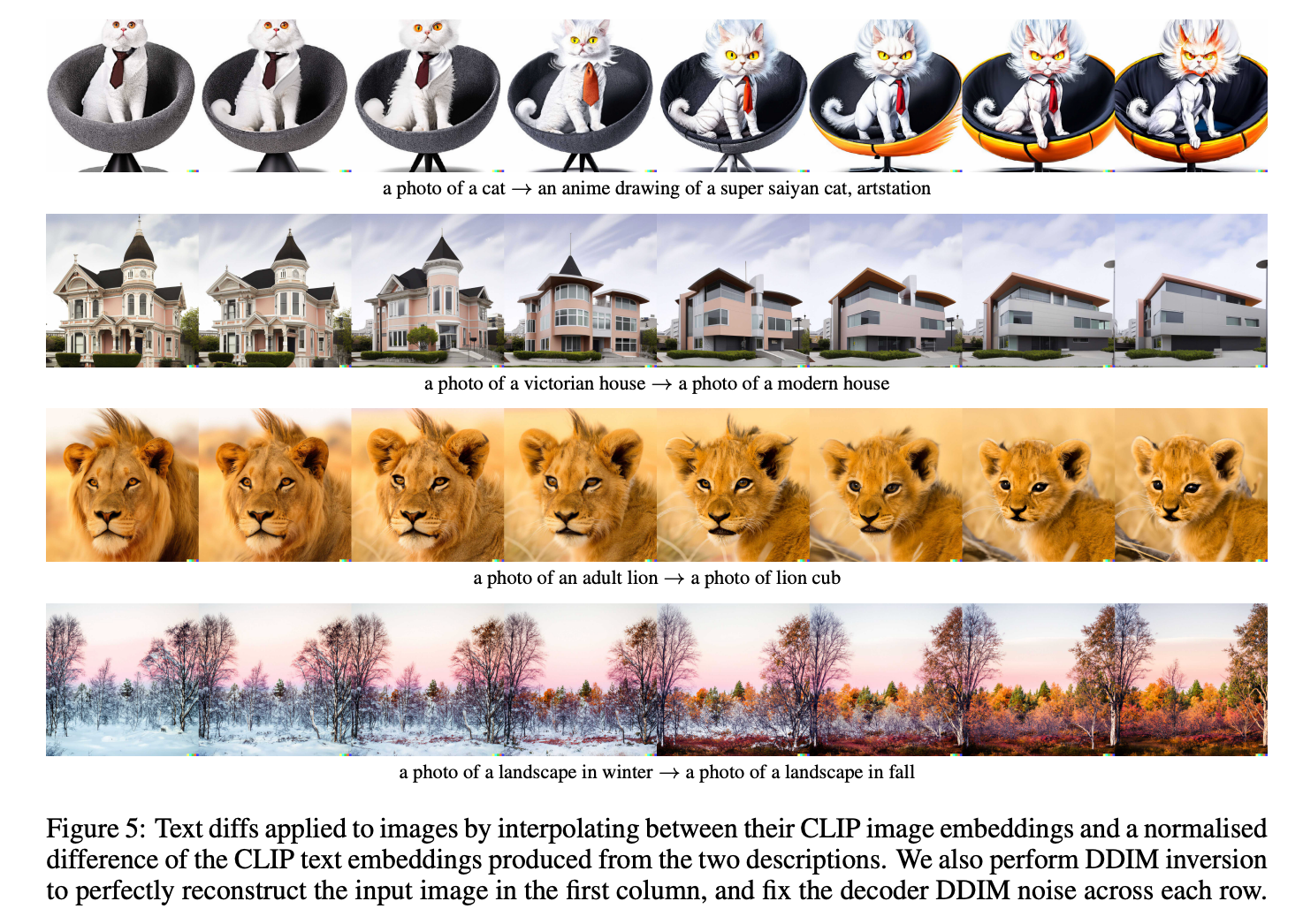 使用CLIP与其他图像表示模型相比的一个关键优势是,它将图像和文本嵌入到相同的潜在空间中,从而允许我们应用语言引导的图像操作(即文本差异),如图5所示。为了修改图像以反映新的文本描述yyy,我们首先获取其CLIP文本嵌入ztz_tzt,以及描述当前图像4^44的标题的CLIP文本嵌入zt0z_{t_0}zt0。然后我们通过取它们的差并进行归一化来计算一个文本差异向量zd=norm(zt−zt0)z_d = \text{norm}(z_t - z_{t_0})zd=norm(zt−zt0)。现在,我们可以使用球面插值在图像CLIP嵌入ziz_izi和文本差异向量zdz_dzd之间进行旋转,产生中间CLIP表示zθ=slerp(zi,zd,θ)z_\theta = \text{slerp}(z_i, z_d, \theta)zθ=slerp(zi,zd,θ),其中θ\thetaθ从0线性增加到最大值,通常在[0.25, 0.50]范围内。我们通过解码插值zθz_\thetazθ来生成最终输出,在整个轨迹中固定基础DDIM噪声为xTx_TxT。
