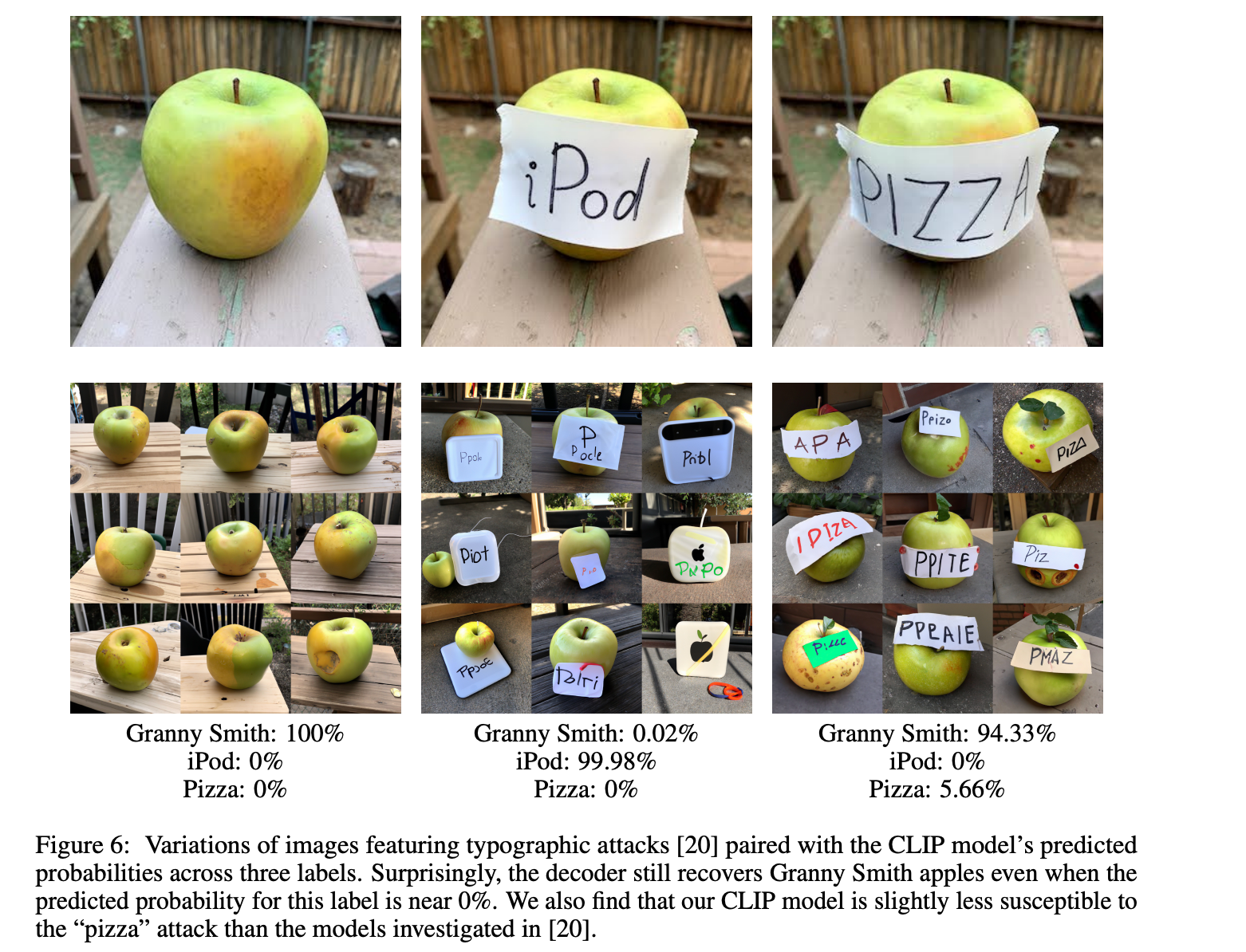 我们的解码器模型提供了一个独特的机会,通过允许我们直接可视化CLIP图像编码器所看到的内容来探索CLIP潜在空间。作为一个示例用例,我们可以重新审视CLIP做出错误预测的情况,例如排版攻击[20]。在这些对抗性图像中,一段文本覆盖在一个物体上,导致CLIP预测文本描述的对象而不是图像中描绘的对象。这段文本在输出概率方面基本上隐藏了原始对象。