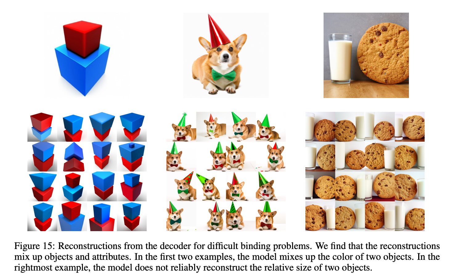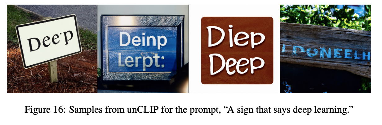 我们假设这是因为CLIP嵌入本身没有显式地将属性绑定到对象,并且发现解码器的重建经常混淆属性和对象,如图15所示。一个类似且可能相关的问题是unCLIP难以生成连贯的文本,如图16所示;可能是因为CLIP嵌入没有精确编码渲染文本的拼写信息。这个问题可能因为我们在BPE编码中模糊了标题中单词的拼写而变得更加严重,因此模型需要独立地在训练图像中看到每个标记被写出来,才能学会渲染它。