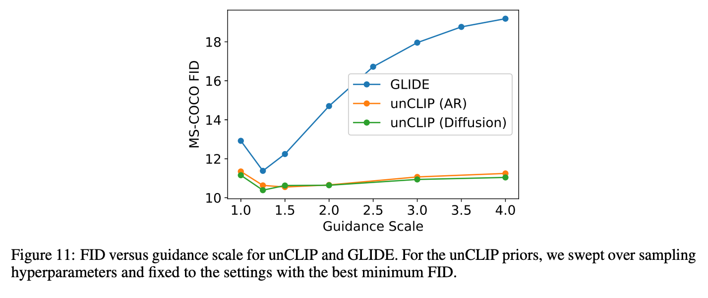 最后,在图11中,我们在对unCLIP和GLIDE的引导尺度进行扫描的同时计算了MS-COCO零样本FID[23],发现引导对unCLIP的FID损害远小于GLIDE。在此评估中,我们固定了unCLIP先验的引导尺度,仅改变解码器的引导尺度。这是另一个迹象,表明引导对GLIDE多样性的损害远大于unCLIP,因为FID严重惩罚非多样性的生成。