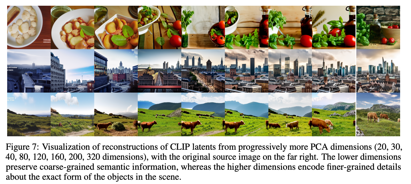 PCA重建提供了另一种探索CLIP潜在空间结构的工具。在图7中,我们取少量源图像的CLIP图像嵌入,并用逐渐增多的PCA维度重建它们,然后使用我们的解码器和固定种子的DDIM可视化重建的图像嵌入。这使我们能够看到不同维度编码了哪些语义信息。我们观察到,早期的PCA维度保留了粗粒度的语义信息,例如场景中有哪些类型的物体,而后期的PCA维度编码了更细粒度的细节,例如物体的形状和确切形式。例如,在第一个场景中,早期维度似乎编码了存在食物和可能一个容器,而后期维度则具体编码了西红柿和一个瓶子。图7也作为AR先验建模的可视化,因为AR先验被训练为显式地按此顺序预测这些主成分。