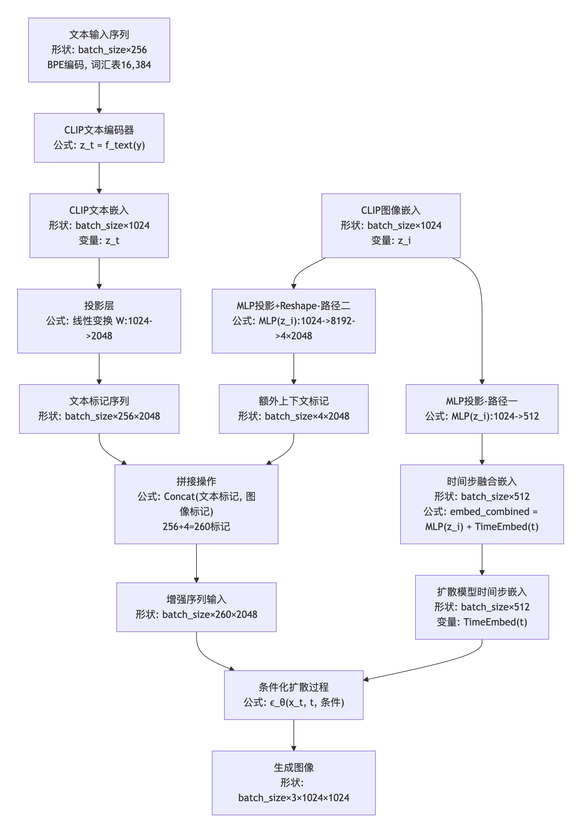 [文本编码] + [CLIP文本嵌入 $z_t$] + [时间步嵌入] + [加噪图像嵌入 $z_i^{(t)}$] → [预测头(输出原始 $z_i$)]