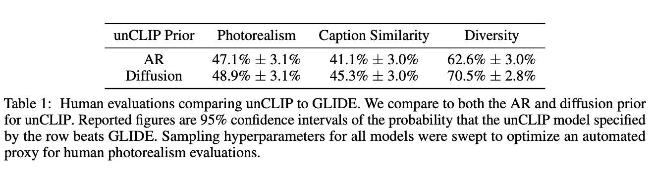 我们在表1中展示了我们的结果。总的来说,在与GLIDE的 pairwise 比较中,扩散先验的表现优于AR先验。我们发现,在照片真实感方面,人类仍然略微偏好GLIDE而不是unCLIP,但差距非常小。即使在照片真实感相似的情况下,unCLIP在多样性方面也明显优于GLIDE,突出了其优势之一。