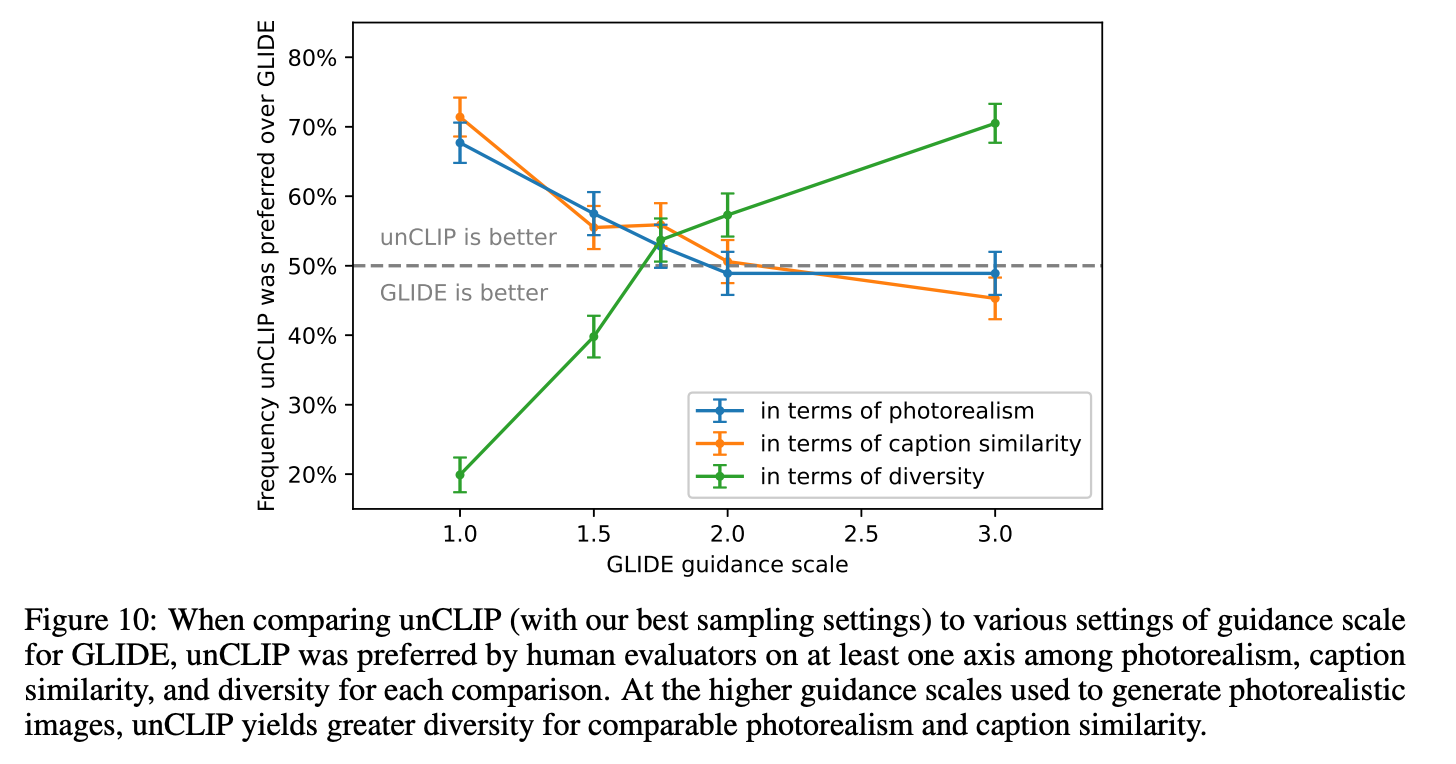 在第5.2节中,我们观察到unCLIP在保持更多多样性的同时实现了与GLIDE相似的照片真实感,但其标题匹配能力稍差。很自然地会问,是否可以降低GLIDE的引导尺度以获得与unCLIP相同的多样性水平,同时保持更好的标题匹配。在图10中,我们通过在不同GLIDE引导尺度下进行人工评估来更仔细地研究这个问题。我们发现,在引导尺度为2.0时,GLIDE在照片真实感和标题相似性方面与unCLIP非常接近,同时仍然产生较少多样性的样本。