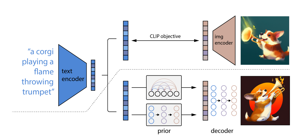 传统文本到图像生成方法通常采用端到端的单一模型,但DALL-E 2创新性地提出了两阶段生成框架 ,将文本到图像的复杂任务分解为两个相对简单的子任务。