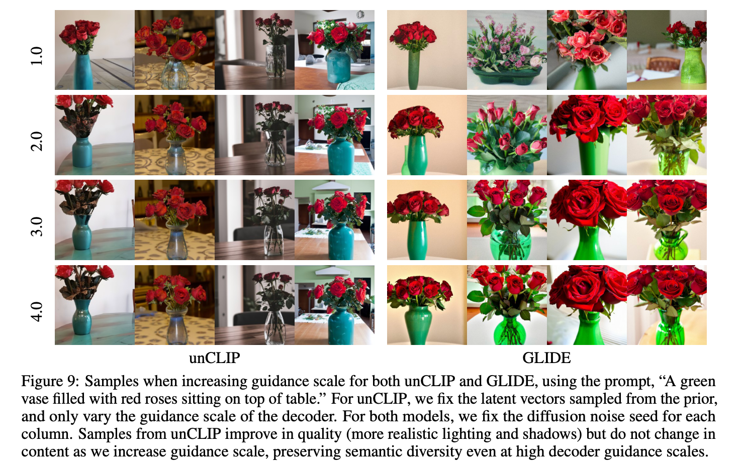 与GLIDE相比,我们定性地观察到unCLIP能够在利用引导技术提高样本质量的同时生成更多样的图像。要理解原因,请考虑图9,其中我们增加了GLIDE和unCLIP的引导尺度。对于GLIDE,语义(相机角度、颜色、大小)随着我们增加引导尺度而收敛,而对于unCLIP,场景的语义信息被冻结在CLIP图像嵌入中,因此在引导解码器时不会崩溃。
