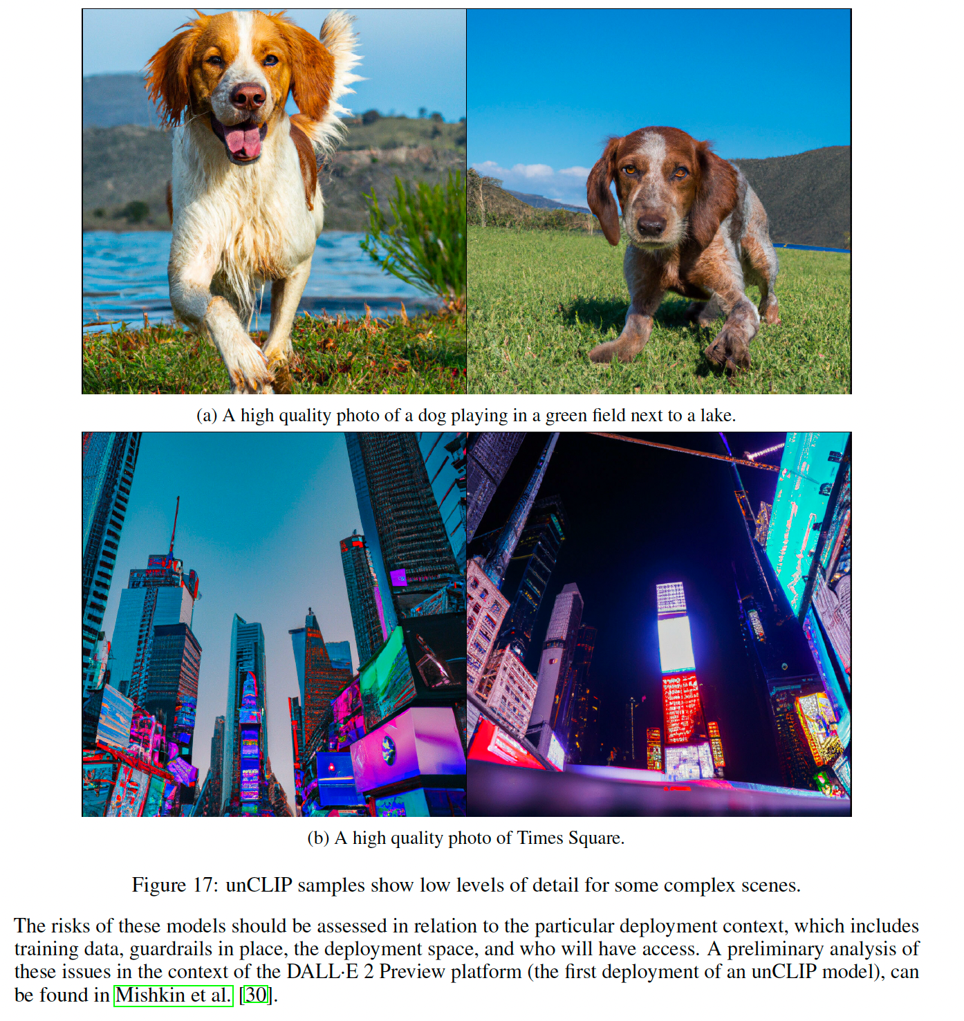 正如GLIDE论文中所讨论的,图像生成模型携带与欺骗性及其他有害内容相关的风险。unCLIP的性能改进也提高了相对于GLIDE的风险状况。随着技术的成熟,它留下的痕迹和指示输出是AI生成的指标更少,使得更容易将生成的图像误认为是真实的,反之亦然。还需要更多研究来了解架构的变化如何改变模型学习训练数据中偏见的方式。
