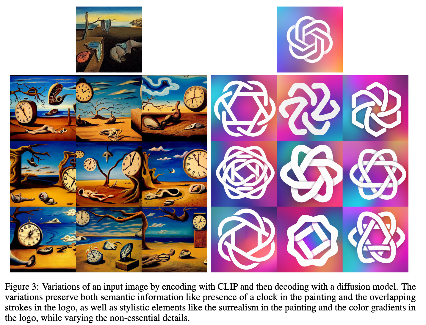 给定一个图像xxx,我们可以生成相关的图像,这些图像共享相同的基本内容,但在其他方面(如形状和方向)有所不同(图3)。为此,我们使用DDIM和η>0\eta > 0η>0进行采样,将解码器应用于二分表示(zi,xT)(z_i, x_T)(zi,xT)。当η=0\eta = 0η=0时,解码器变为确定性的,并将重建给定图像xxx。较大的η\etaη值在连续采样步骤中引入了随机性,从而产生感知上以原始图像xxx为中心的变体。随着η\etaη的增加,这些变体告诉我们哪些信息被捕获在CLIP图像嵌入中(因此在样本间保留),以及哪些信息丢失了(因此在样本间变化)。