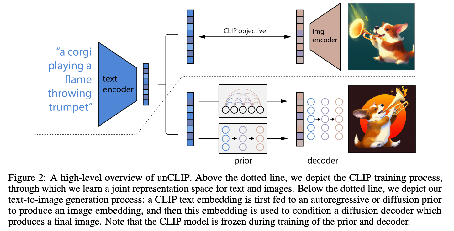 我们的训练数据集由图像xxx及其对应标题yyy的配对(x,y)(x,y)(x,y)组成。给定图像xxx,令ziz_izi和ztz_tzt分别为其CLIP图像和文本嵌入。我们设计我们的生成堆栈,使用两个组件从标题生成图像: