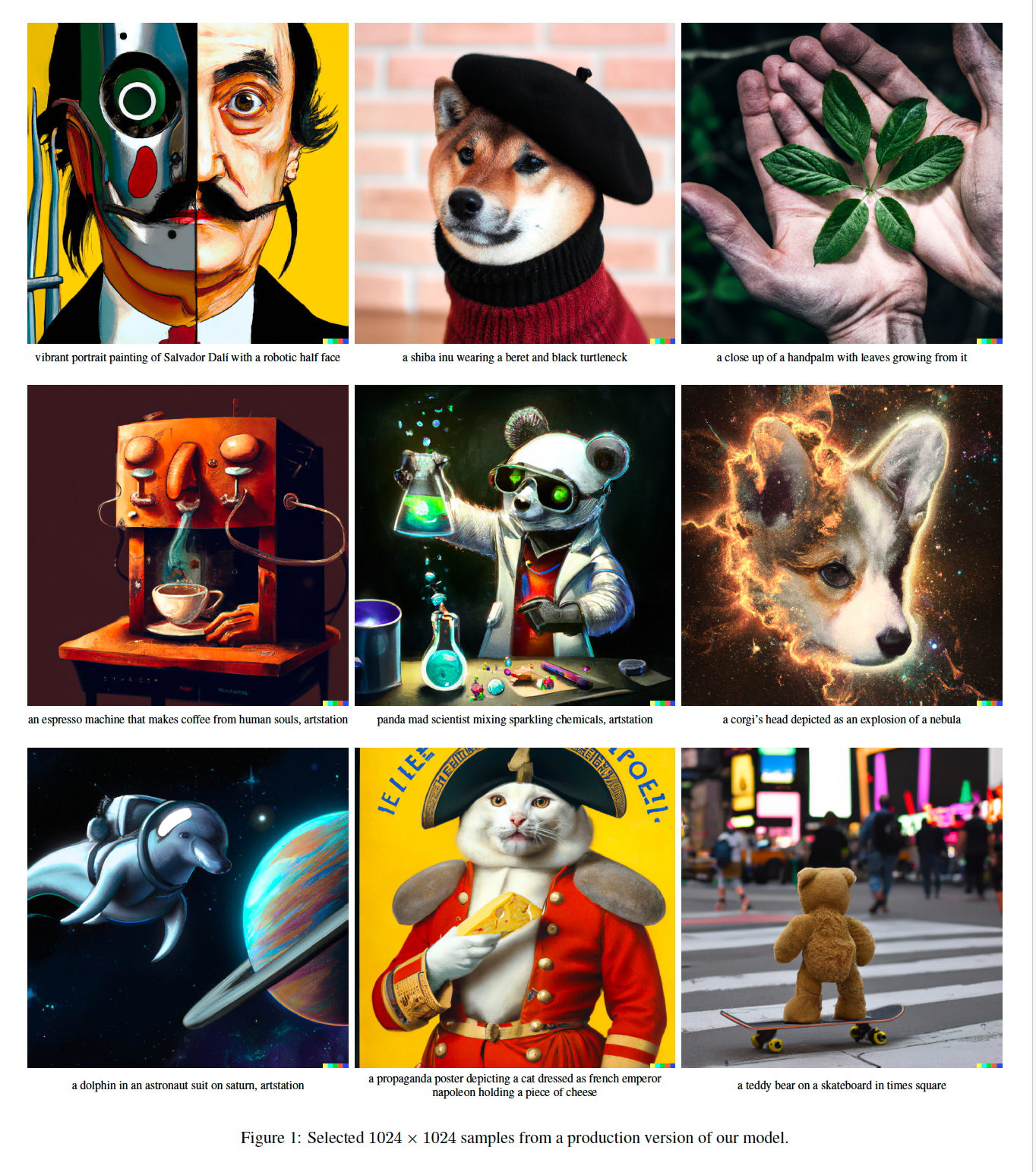 为了生成高分辨率图像,我们训练了两个扩散上采样模型[34, 43]:一个将图像从64x64上采样到256x256分辨率,另一个进一步将这些图像上采样到1024x1024分辨率。为了提高上采样器的鲁棒性,我们在训练期间对条件图像进行轻微破坏。对于第一个上采样阶段,我们使用高斯模糊[43],对于第二个阶段,我们使用更多样化的BSR退化[42, 59]。为了减少训练计算量并提高数值稳定性,我们遵循Rombach等人[42]的方法,在目标大小四分之一大小的随机裁剪图像上进行训练。我们在模型中仅使用空间卷积(即没有注意力层),在推理时直接以目标分辨率应用模型,观察到它能够很好地泛化到更高分辨率。我们发现上采样器以标题为条件没有好处,因此使用无条件的ADMNets[11]且不进行引导。