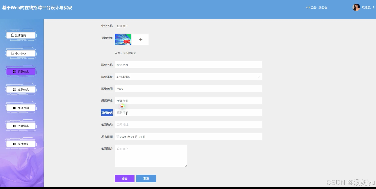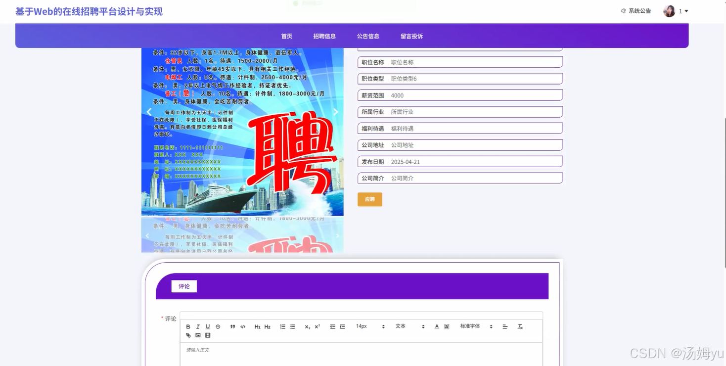传统招聘模式下,求职者获取招聘信息的渠道有限,往往需要花费大量时间和精力在多个平台搜索,且信息真实性难以保证。基于Spring Boot的在线招聘系统能够整合海量招聘信息,求职者只需通过简单操作,即可快速筛选出符合自身需求的岗位,大大节省了求职成本。同时,系统可借助智能算法,根据求职者的简历和求职意向,精准推送匹配度高的职位,提高求职成功率。此外,在线招聘系统支持线上投递简历、视频面试等功能,打破了时间和空间的限制,让求职者能够更加便捷地参与招聘流程,尤其是为异地求职者提供了极大便利。