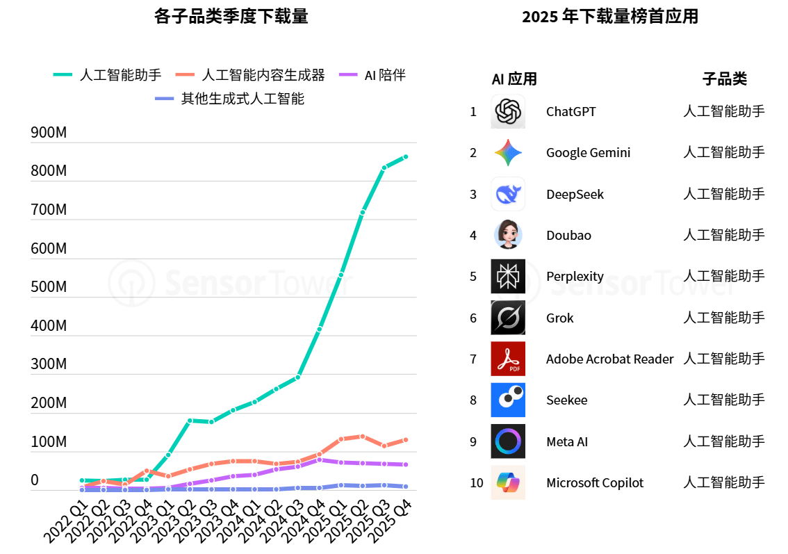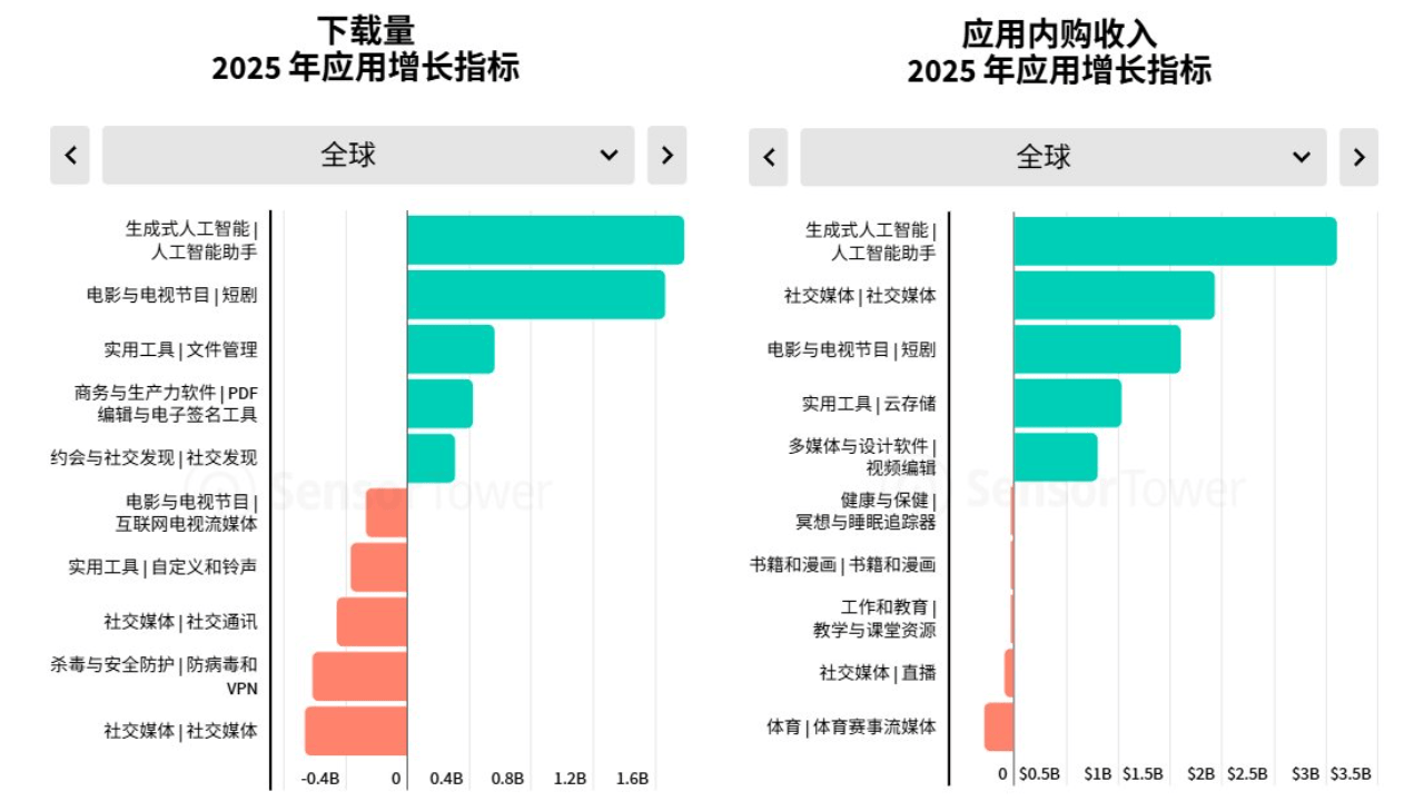 AI助手也成为当前最受欢迎的生成式AI品类,同时在2025年下载量与IAP收入增长榜中位列第一。