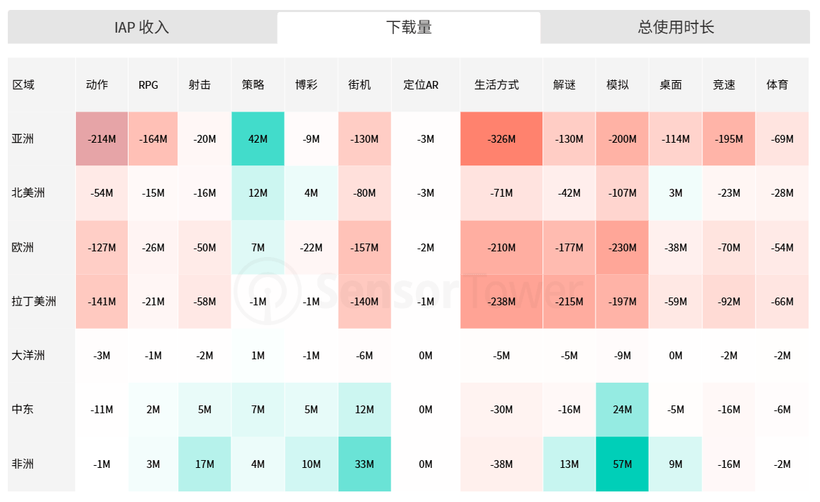 值得关注的是,策略游戏是2025年唯一在亚洲、北美、欧洲三大区域下载量均实现增长的品类,展现出强劲的增长潜力。与之相对,其他多数品类在主要地区下载量均呈下降趋势,生活方式、模拟、解谜类游戏跌幅较为明显。