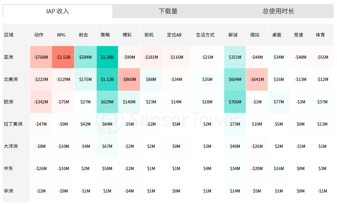 从品类与区域表现来看,休闲与中度游戏仍是IAP收入的主要贡献者。其中,策略类游戏成为多地收入增长的核心驱动力,主要得益于东方发行商在4X策略赛道的爆发,以《Last War: Survival》《Whiteout Survival》为代表。解谜类游戏在欧洲表现稳健,《Royal Match》稳居头部,《Gossip Harbor》贡献显著增量。射击游戏则在亚洲市场表现强劲,受《Delta Force》(三角洲行动)等新作带动明显。