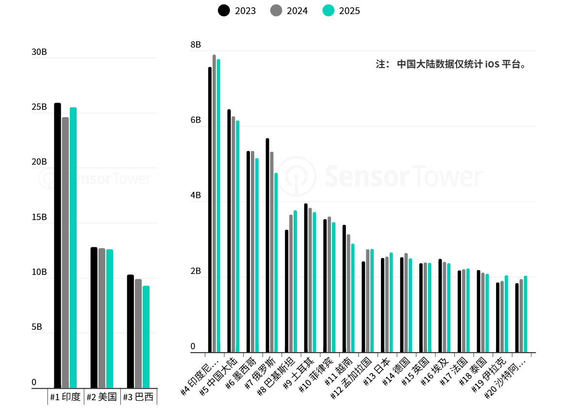 下载量方面,**2025年全球新增应用下载量约为1,490亿次,同比微增0.8%,**平均每分钟下载量达28.4万次。然而,与收入的普遍增长不同,全球下载量前十市场中,仅印度与巴基斯坦实现同比增长。其中印度市场在2024年经历显著下滑后,于2025年呈现强势回升,成为全球下载增长的关键驱动力。
