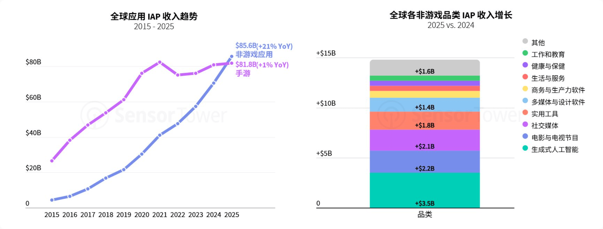 值得关注的是,非游戏应用收入持续攀升,并在2025年实现历史性跨越:非游应用内购收入首次超过移动游戏,达到约850亿美元,同比增长20%,规模已接近五年前的2.8倍。几乎所有非游戏品类在2025年均实现IAP收入正增长,印证了非游应用在用户留存与付费深度上的全面增强。