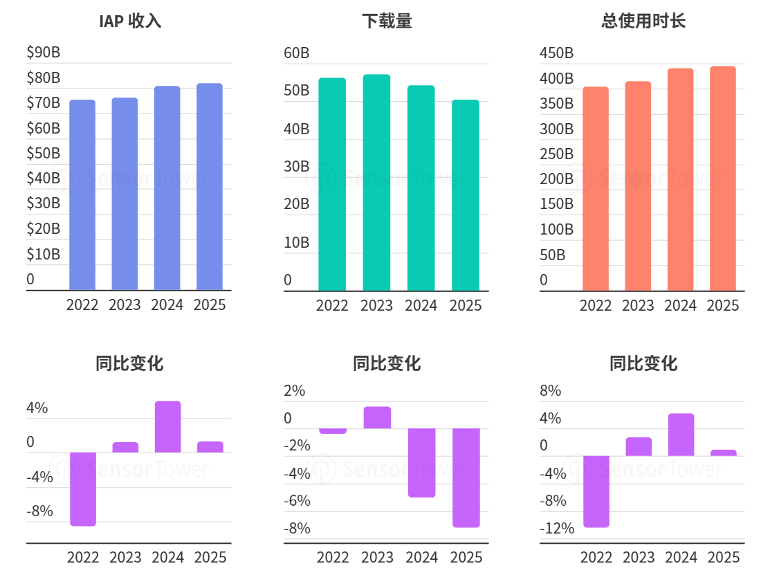 2025年,App Store与Google Play上的移动游戏IAP收入同比增长1.3%,实现连续三年增长;下载量则同比下降7.2%,反映出全球移动游戏市场正从规模扩张向精细化运营转型。