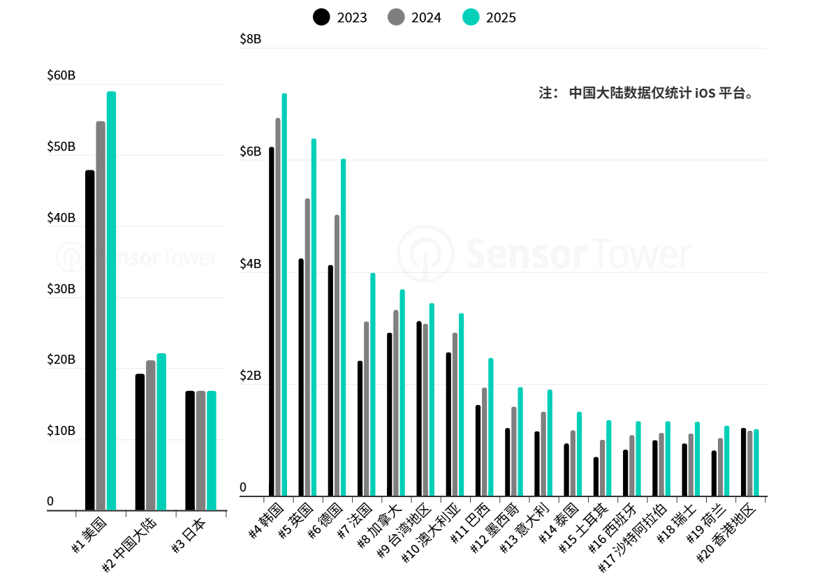 2025年,全球主要移动市场表现稳健。iOS与Google Play双平台的应用内购(IAP)总收入达到1,670亿美元,同比增长10.6%, 平均每分钟用户支出达31.8万美元。从区域分布看,自2023年至2025年,绝大多数核心市场的移动应用IAP收入均保持增长。**美国仍为全球最大移动收入市场,2025年消费者支出规模接近600亿美元;**中国大陆与日本紧随其后。西欧市场也在英国、德国、法国等主力国家的带动下,持续释放增长动能。