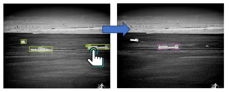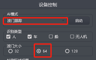 点击设备画面激活后,AI 模式中选择"波门跟踪",点击"启动",选择合适的波门大小(固定跟踪框水平与垂直方向像素数量),点击画面位置即可跟踪。