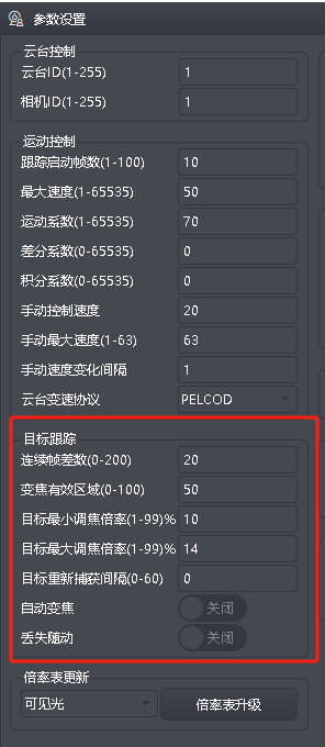 选中设备,单击"参数设置"按钮,弹出参数设置界面,显示目标跟踪参数。