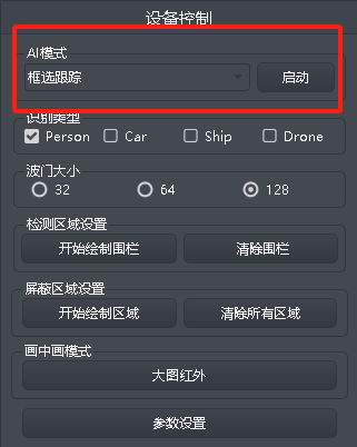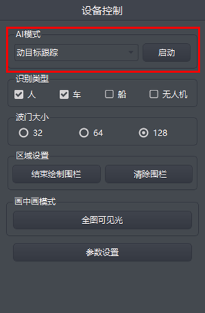- 在"设备控制"界面中,将 AI 模式切换为"框选跟踪",并单击"启动"按钮。