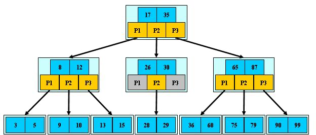 关键字个数比孩子节点个数小1。即如果一个节点有k个关键字,那么它就有k + 1个孩子。如下图所示为一棵3阶B树的结构示意图,根节点有2个关键字和3个指针,它有3个孩子,这些孩子分别对应关键字划分的3个区间:
