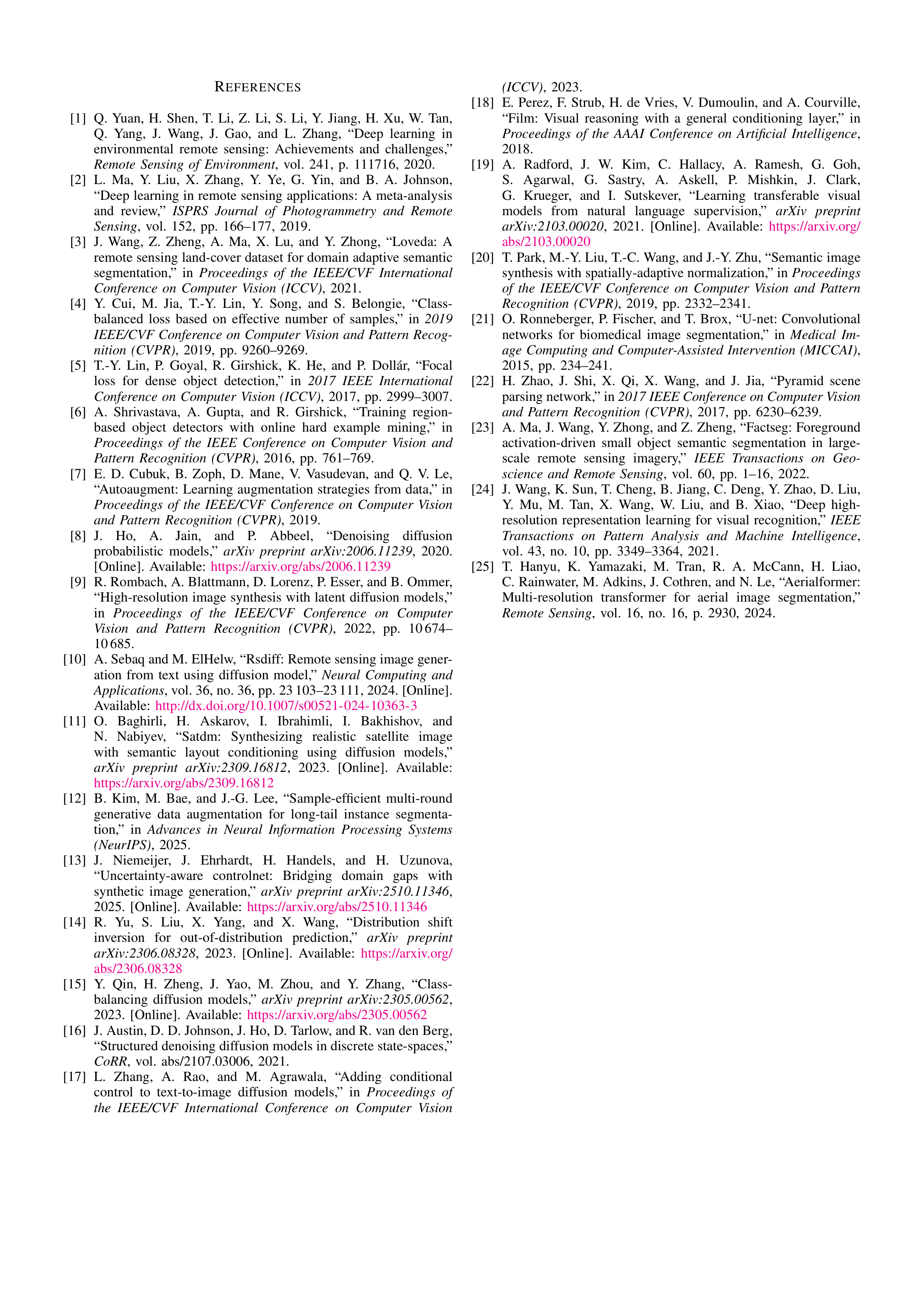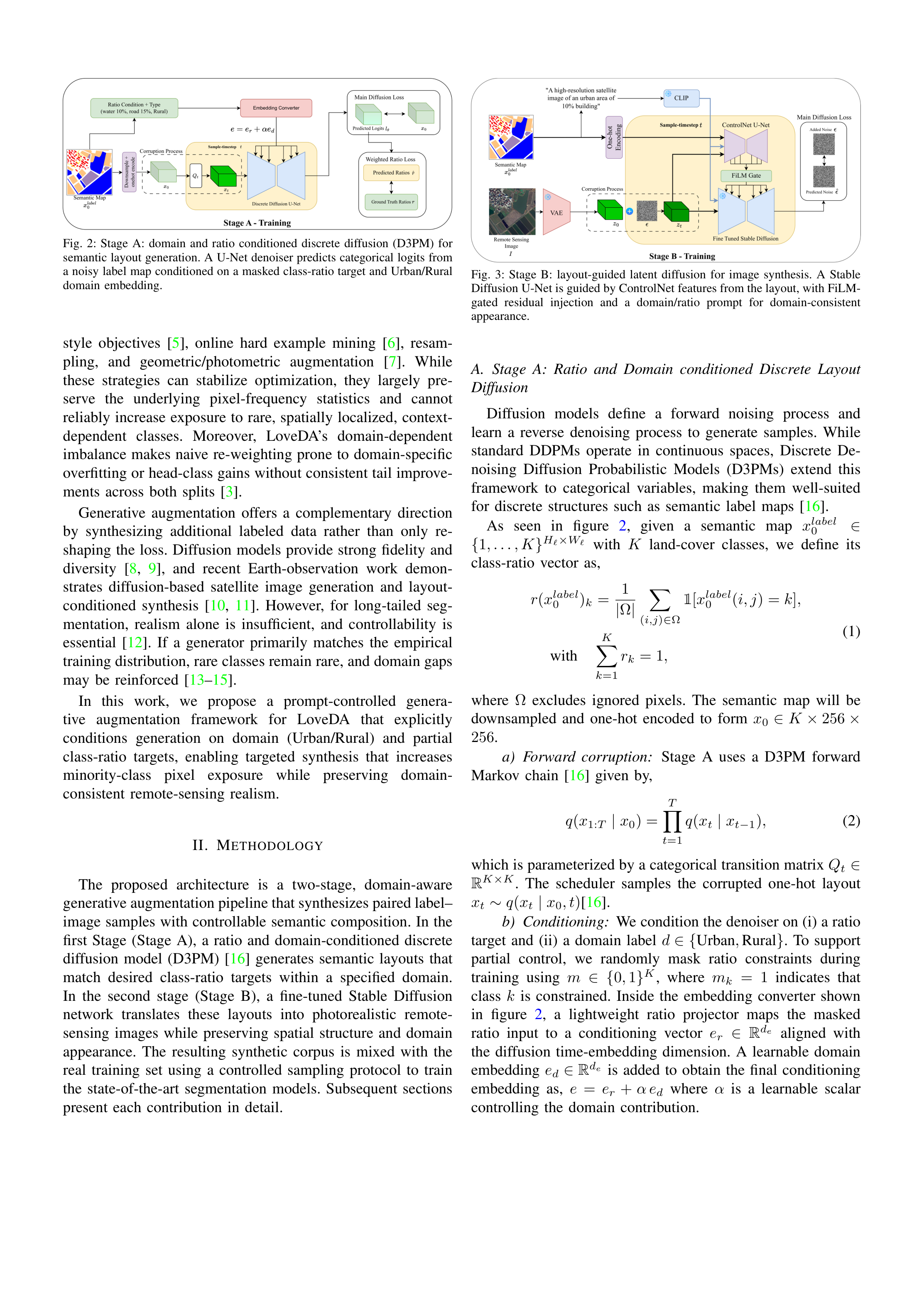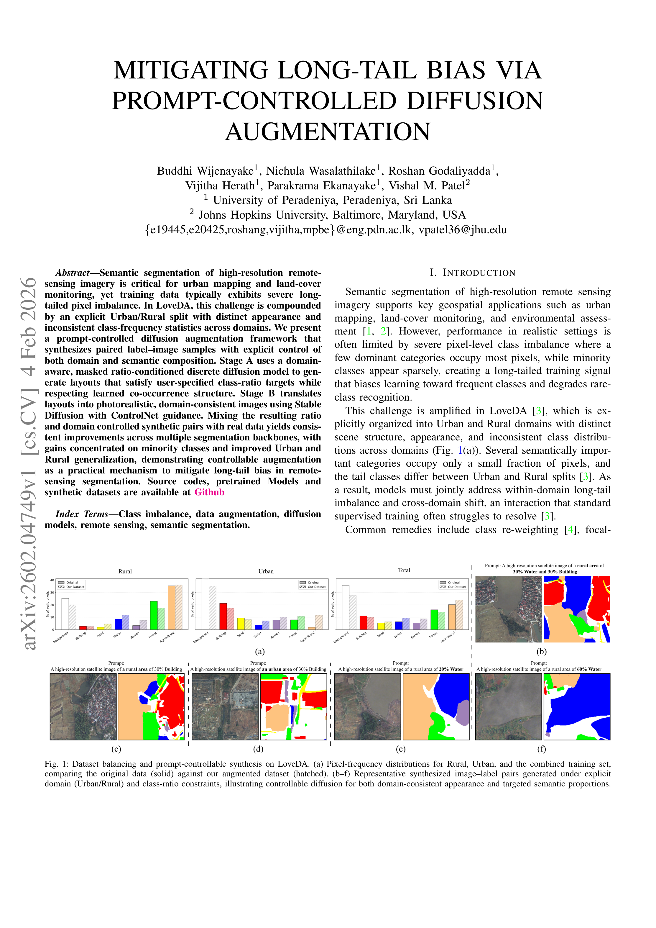 Original Abstract: Semantic segmentation of high-resolution remote-sensing imagery is critical for urban mapping and land-cover monitoring, yet training data typically exhibits severe long-tailed pixel imbalance. In the dataset LoveDA, this challenge is compounded by an explicit Urban/Rural split with distinct appearance and inconsistent class-frequency statistics across domains. We present a prompt-controlled diffusion augmentation framework that synthesizes paired label--image samples with explicit control of both domain and semantic composition. Stage~A uses a domain-aware, masked ratio-conditioned discrete diffusion model to generate layouts that satisfy user-specified class-ratio targets while respecting learned co-occurrence structure. Stage~B translates layouts into photorealistic, domain-consistent images using Stable Diffusion with ControlNet guidance. Mixing the resulting ratio and domain-controlled synthetic pairs with real data yields consistent improvements across multiple segmentation backbones, with gains concentrated on minority classes and improved Urban and Rural generalization, demonstrating controllable augmentation as a practical mechanism to mitigate long-tail bias in remote-sensing segmentation. Source codes, pretrained models, and synthetic datasets are available at \href{https://github.com/Buddhi19/SyntheticGen.git}{Github}