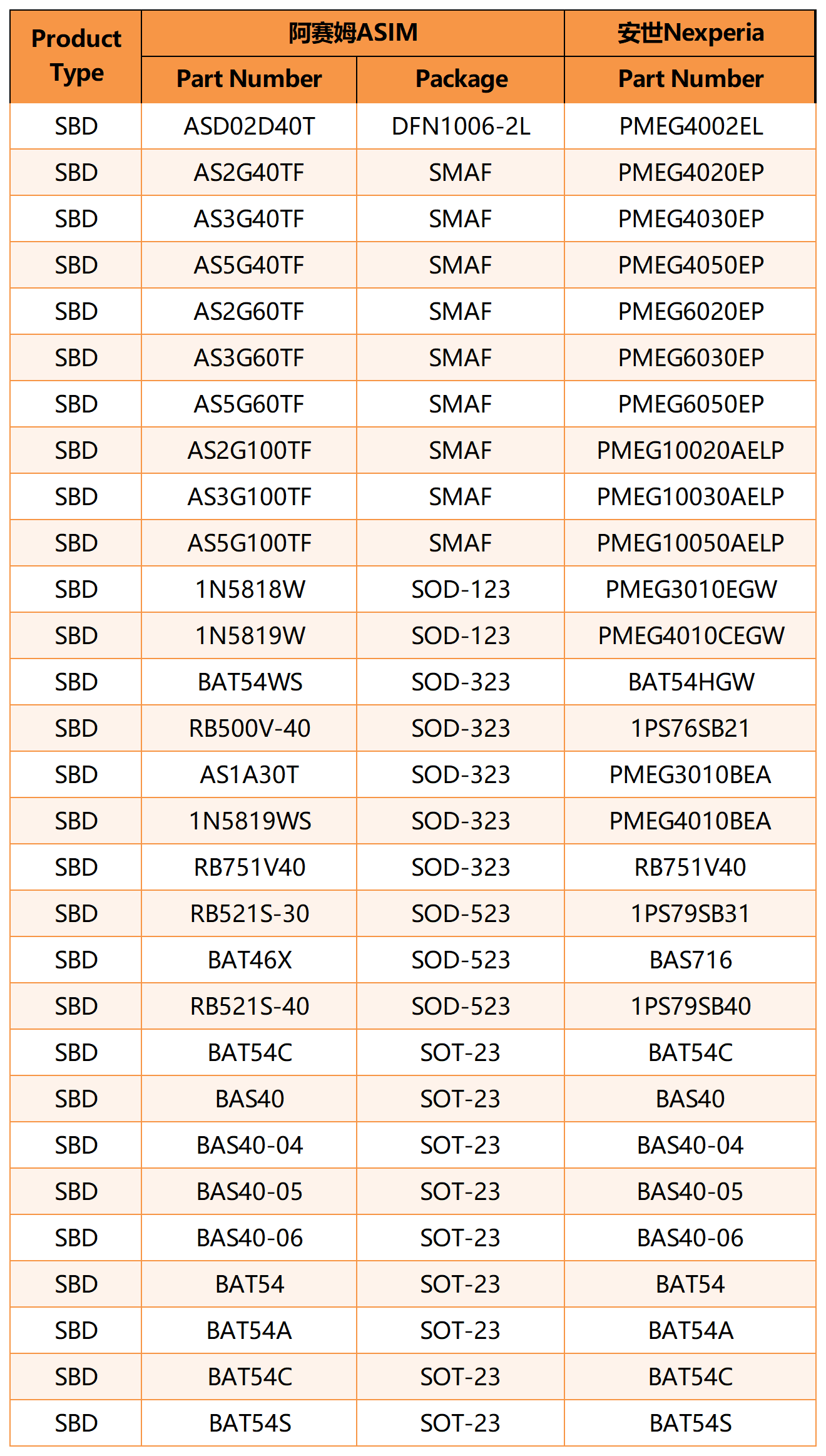 阿赛姆电子产品严格遵循国际质量标准,关键性能指标达到行业主流水平,多款型号可实现与主流国际品牌的引脚兼容与性能匹配,为客户提供平滑的选型替代路径。肖特基二极管替代方案: