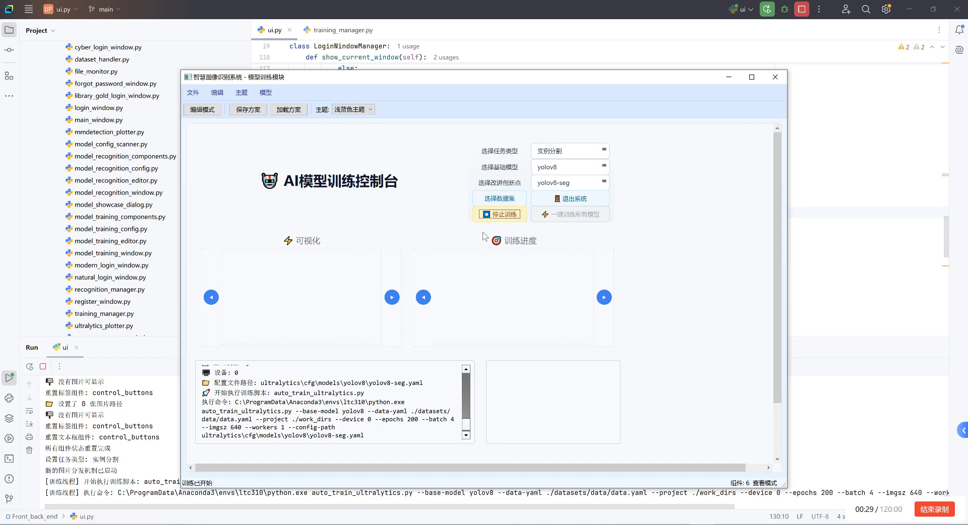 图2展示了模型训练的控制台界面,通过配置YOLOv8-seg模型(适用于分割任务),可对车窗图像数据进行训练,实现车窗区域的精准识别。界面右侧的设置区域包含"选择任务类型"(实例分割)、"选择基础模型"(yolov8)、"选择改进创新点"(yolov8-seg)的下拉选项,以及"选择数据集"按钮,这些都是配置训练过程的关键参数。